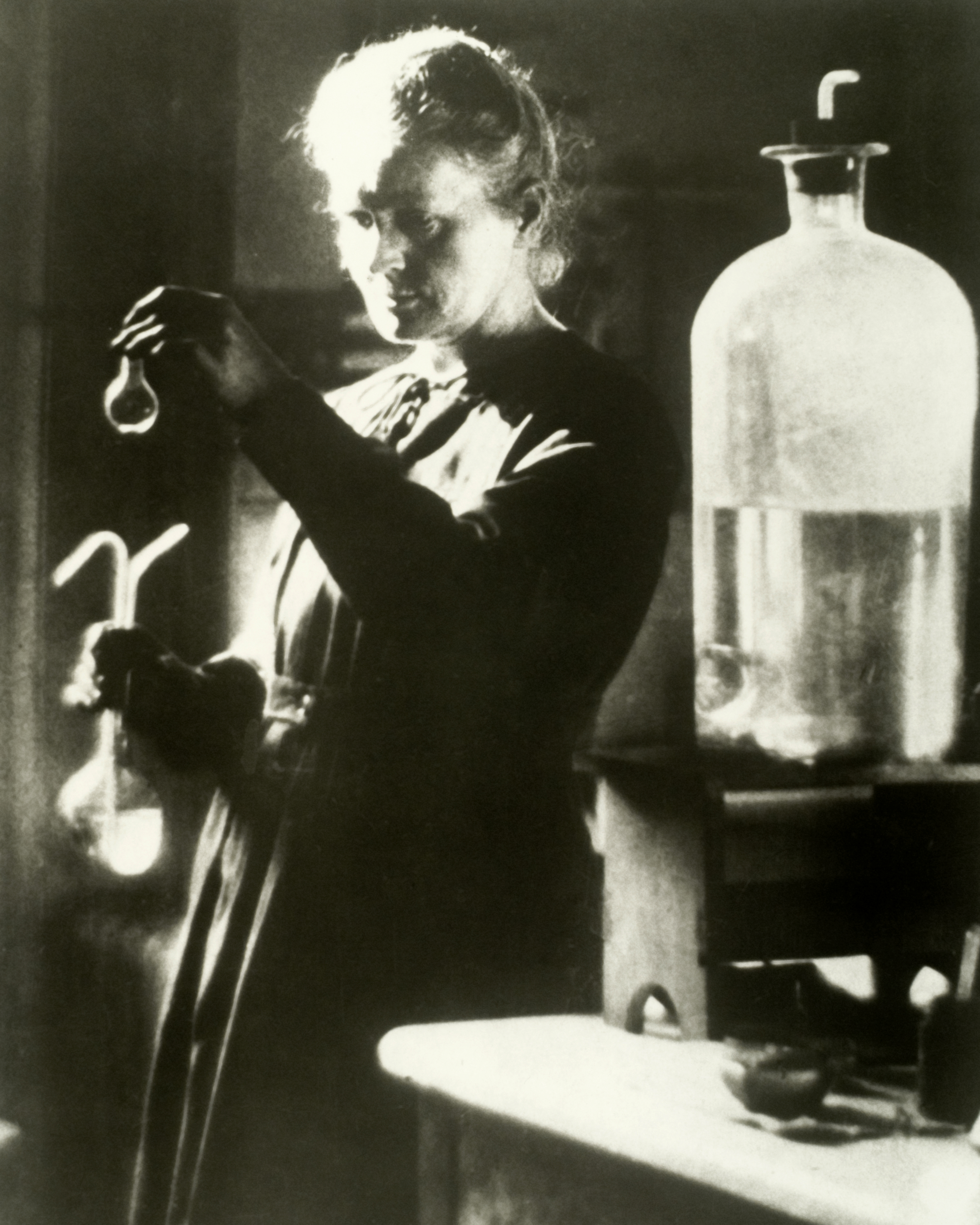 Marie Curie works in her laboratory. Curie Marie B2