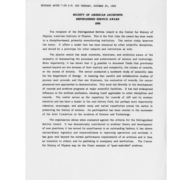 Caption: The Society of American Archivists (SAA) Distinguished Service Award announcement letter, 1985. Scanned from the American Institute of Physics Center for History of Physics addition to miscellaneous publications, 1963-2017. American Institute of Physics, Niels Bohr Library & Archives, College Park, MD 20740, USA.