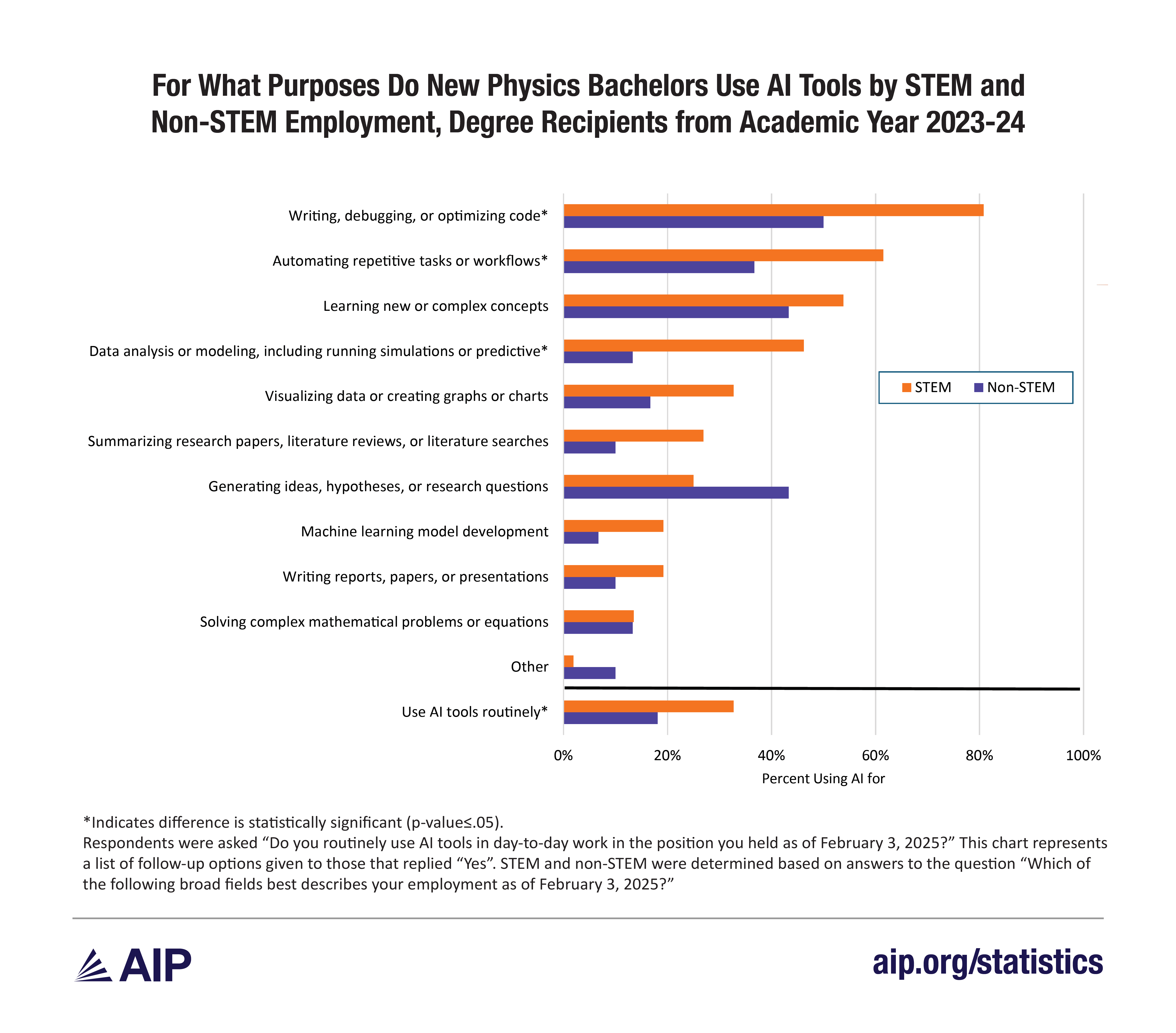 Overall, new physics bachelor’s recipients employed in STEM (science, technology, engineering, and mathematics) fields were more likely to regularly use AI tools than those working in non-STEM fields—33% versus 18%, respectively (Figure 2).