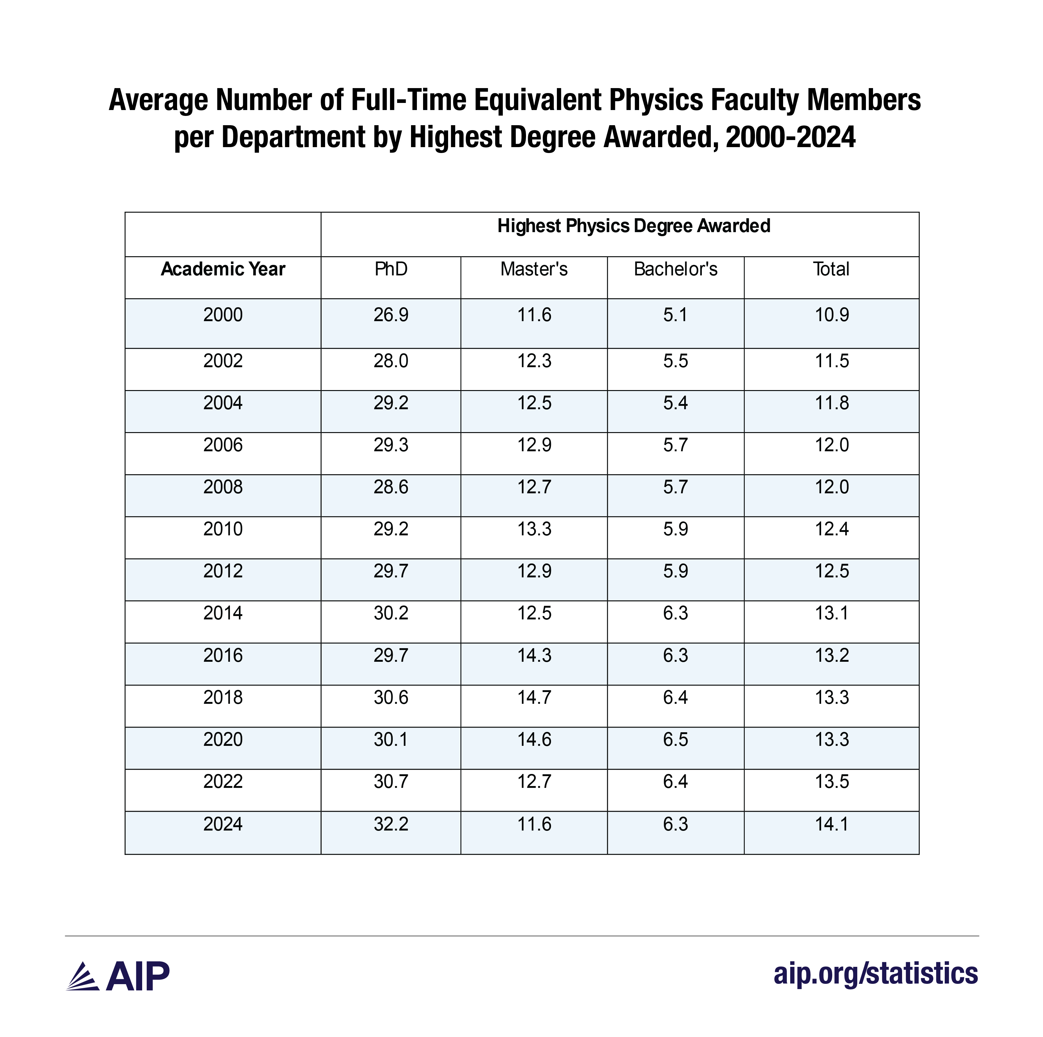 Average Number of Full-Time Equivalent Physics Faculty Members per Department by Highest Degree Awarded, 2000-2024