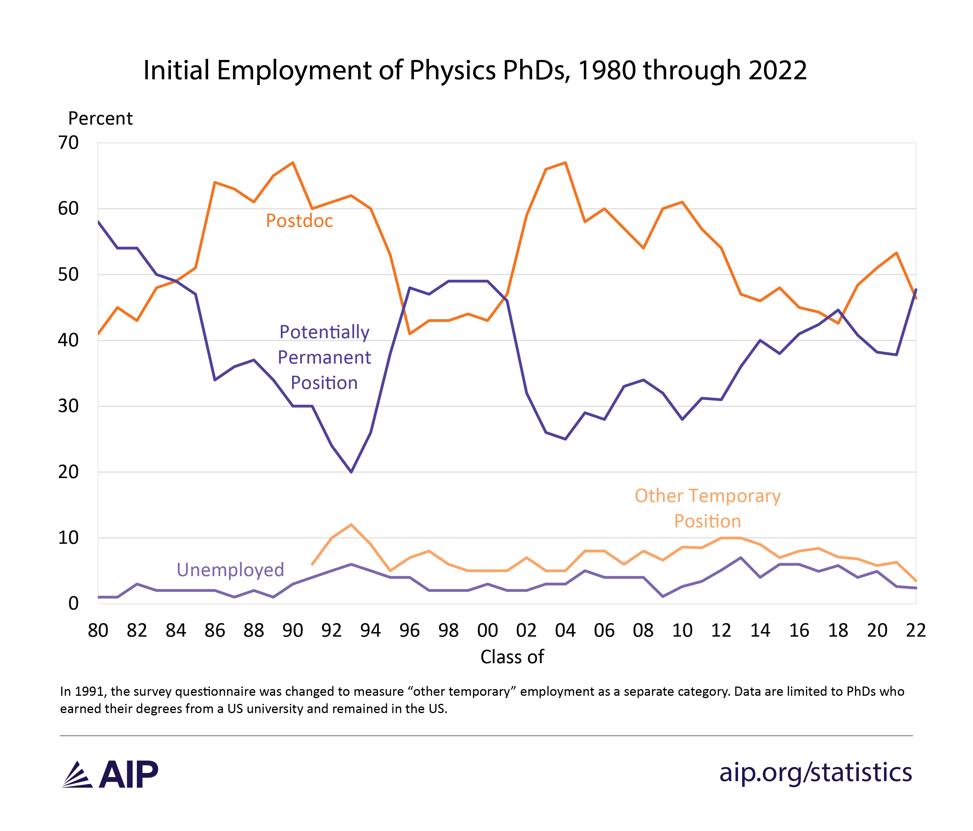 Initial Employment of Physics PhDs, 1980 through 2022