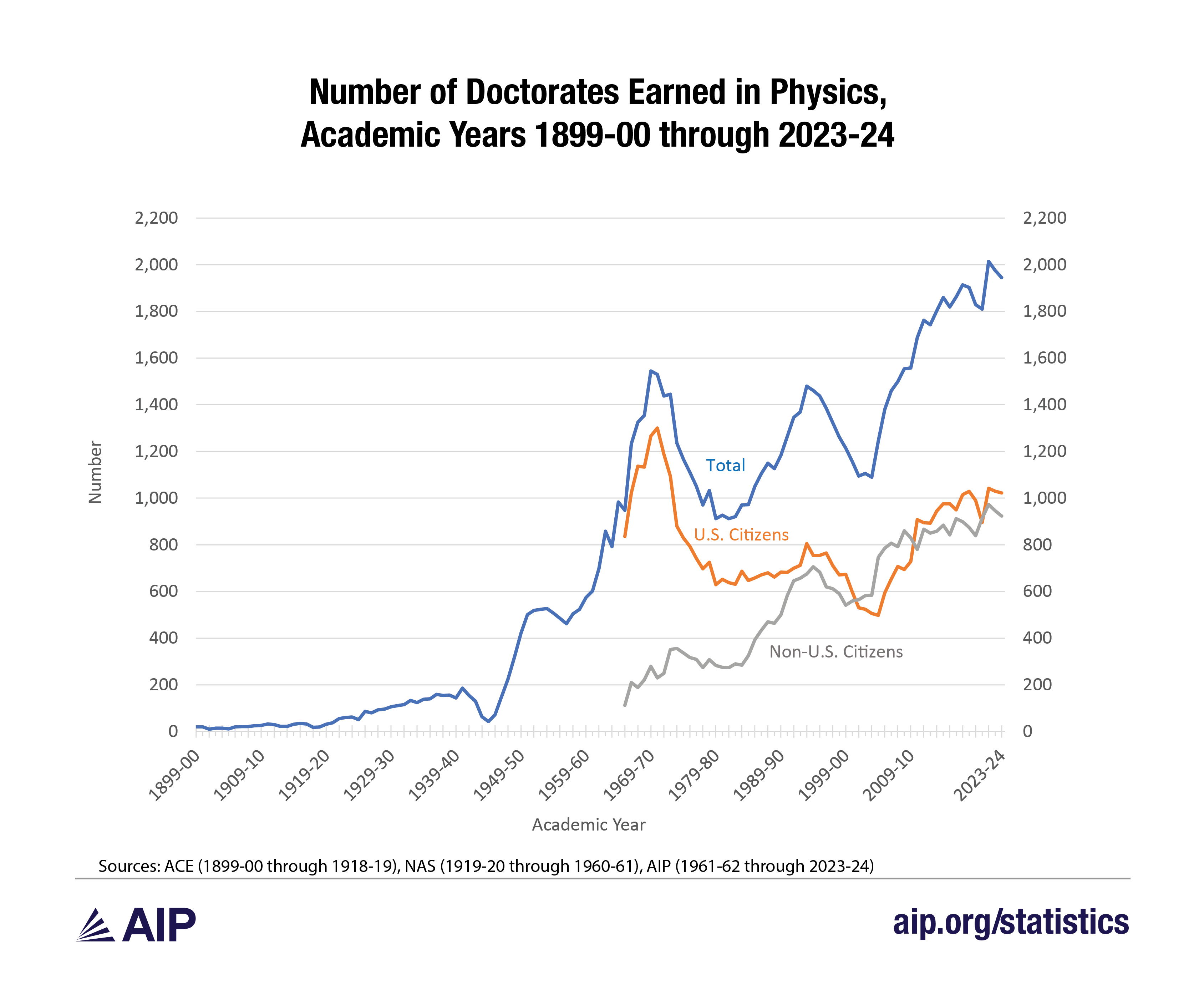 Number of Doctorates Earned in Physics, Academic Years 1899-00 through 2023-24