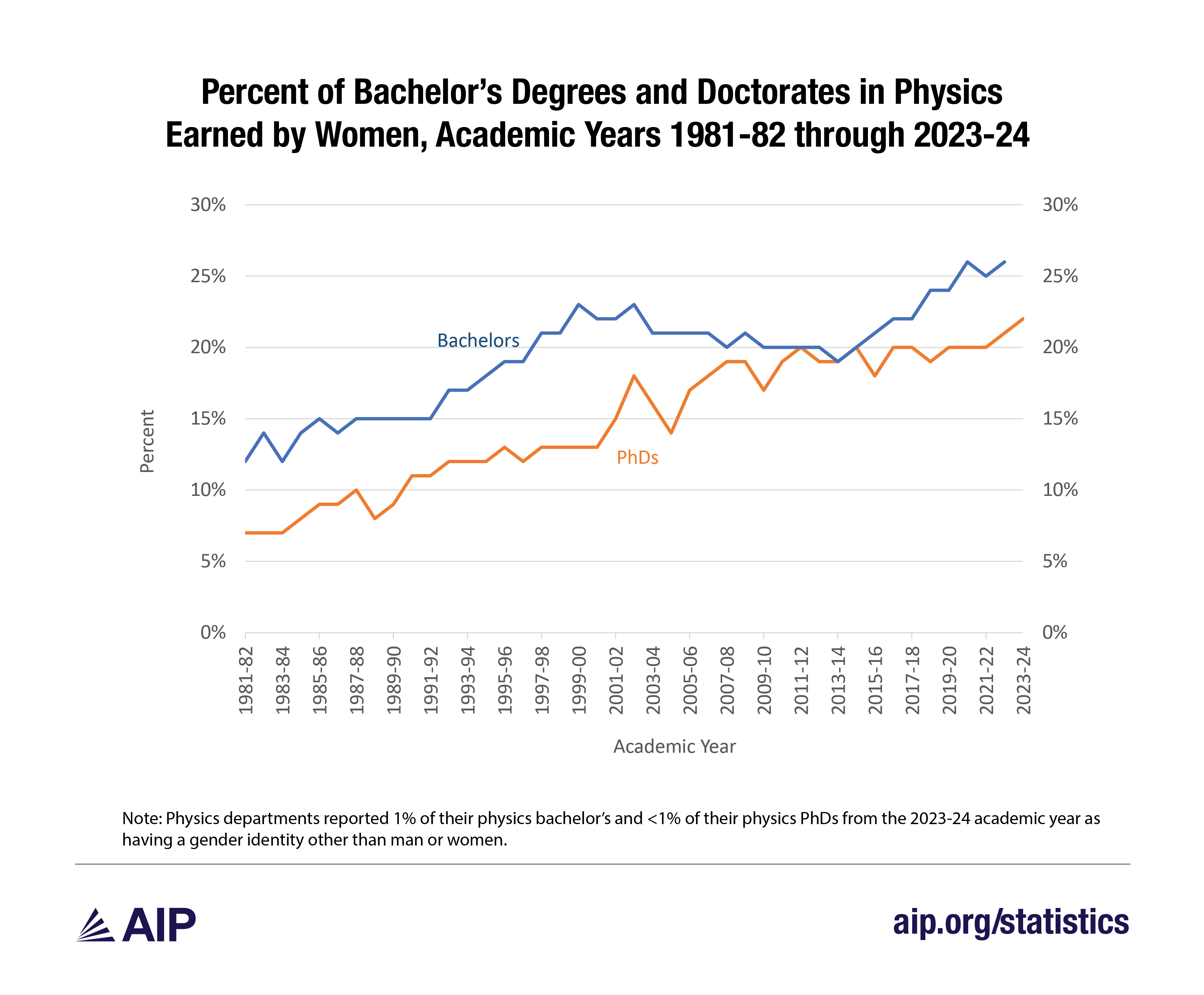 Percent of Bachelor’s Degrees and Doctorates in Physics Earned by Women, Academic Years 1981-82 through 2023-24